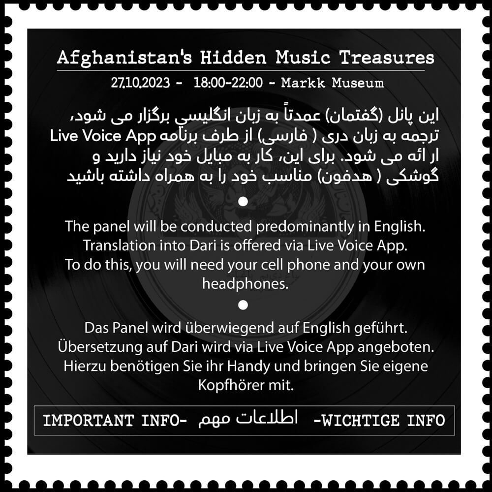 Anschließend führt Dr. Mejgan Massoumi (Historikerin, Universität Stanford) mit einer Keynote zum Thema ein, erweitert durch eine Paneldiskussion mit Omid Jam/Omjvinyls (Privatsammler und DJ aus San Francisco), Munazza Ebtikar (Nahoststudien/Anthropologie, Universität Oxford) sowie Mirwaiss Sidiqi (Ethnomusikologe/Direktor Aga Khan Music Initiative).